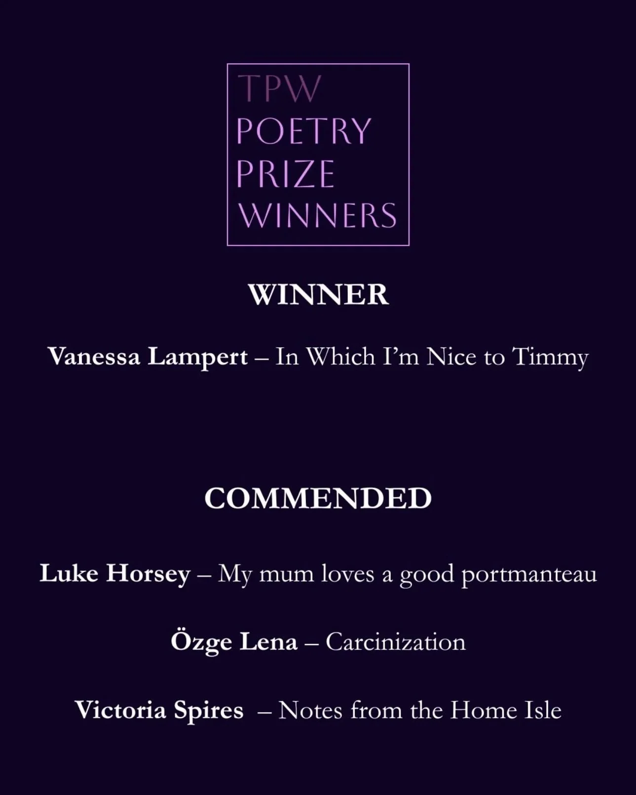 Luke’s poem “My mum loves a good portmanteau” is commended for the TPW Poetry Prize, judged by Andrew Jamison.